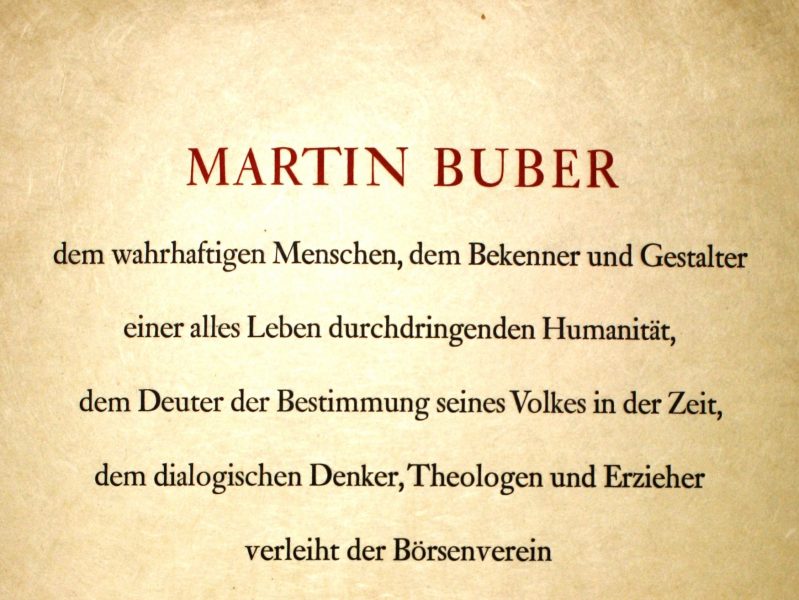 The prize – which today is considered quite prestigious – was at the time just starting out: Buber was the fourth recipient. Those present at the ceremony in Frankfurt proved to what extent granting the prize to a Jewish philosopher was significant for the prize committee and for those involved in the matter: among the guests of honor was Theodor Huess, the first president of the Federal Republic of Germany. During the ceremony, four people spoke: Arthur Georgi, at the time Chairman of the German Booksellers Association, Frankfurt Mayor Walter Kolb, Albrecht Goes, Protestant theologian and author, who spoke in praise of the work of Martin Buber and its importance, and finally, the winner of the prize himself spoke. Buber’s speech was entitled “Genuine Dialogue and the Possibilities of Peace” (“Das echte Gespräch und die Möglichkeit des Friedens”). In his speech, he of course made reference to the dark memories of the days of the Holocaust, declaring: “And who am I to ‘forgive’!” At the same time, Buber called upon the nations to find ways to embark on a humanistic discourse, for the sake of peace and mutual understanding. In his speech at this auspicious occasion, Buber remained faithful to the philosophy of dialogue that he developed and promoted through many decades of academic and public activity.