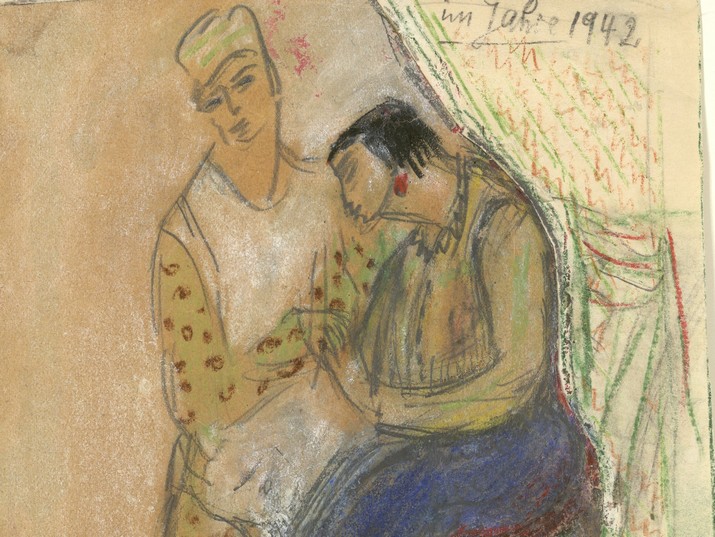 In addition, Lasker-Schüler made a sketch entitled “Drawing in 1935 in the Hospital following Injuries due to the Nazis.” And yet, on the drawing itself, she wrote “in 1942” and by way of summary, also “1935-1942.” At the center of the drawing one can make out two human forms; a woman is sitting, her gaze case downwards, arms linked with another figure that is standing next to her. The woman in the drawing is apparently Lasker-Schüler herself, and indeed, the contours of the woman’s profile recall her other self-portraits. The second figure, apparently a man in Oriental dress including a head covering, is soothing the woman, whose body language powerfully suggests weariness and mourning.