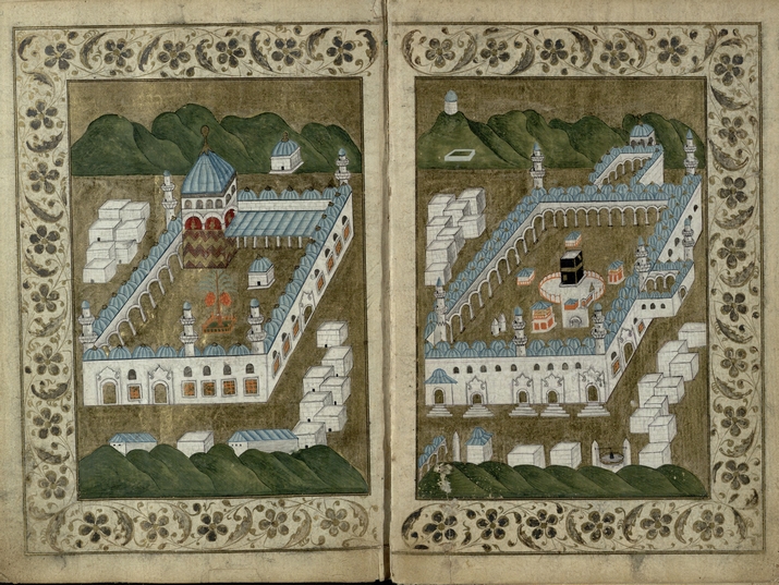 It is no wonder then that Muslims throughout the ages have made and used images of Mecca as a means of spiritual inspiration. The NLI collection contains numerous manuscript copies of a fifteenth century collection of blessings for the Prophet Muhammad known as the Dala’il al-khayrat wa-shawariq al-anwar fi dhikr salat ‘ala nabi al-mukhtar (“The Signs of Benefits and the Brilliant Bursts of Light in the Recitation of Prayers on the Chosen Prophet”). Composed by the Sufi mystic Muhammad b. Sulayman al-Jazuli (d. 1465), it was one of the most popular Muslim prayer manuals, with copies originating from Indonesia to Morocco. Many manuscripts of the text contain two illustrations: one of Mecca, including the Ka‘ba and other sacred sites, and the other of Medina, the location of the Prophet’s mosque. The images, from different times and places and composed in different styles, reflect the chronological and cultural diversity of the Muslim world. However, at the same time they speak to a shared and unifying desire: to approach the Ka‘ba in order to transcend the Ka‘ba and thereby to find one’s true self.