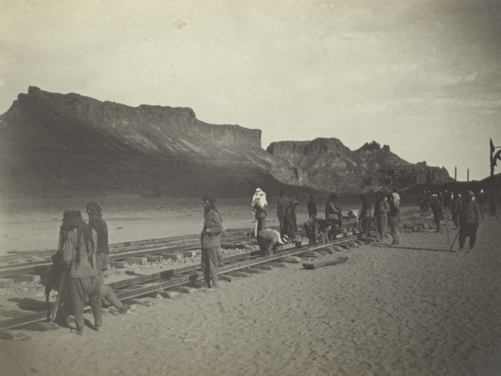 One black and white photograph shows train cars crossing a low, arched brick bridge in the midst of a desert, passing from nowhere to nowhere between sand and sky. In another, a line of workmen stand next to just-laid tracks. A third picture has been taken from inside the moving train, its shadow falling on the ground. Rails curve into the distance under the hulking presence of a massive desert rock.